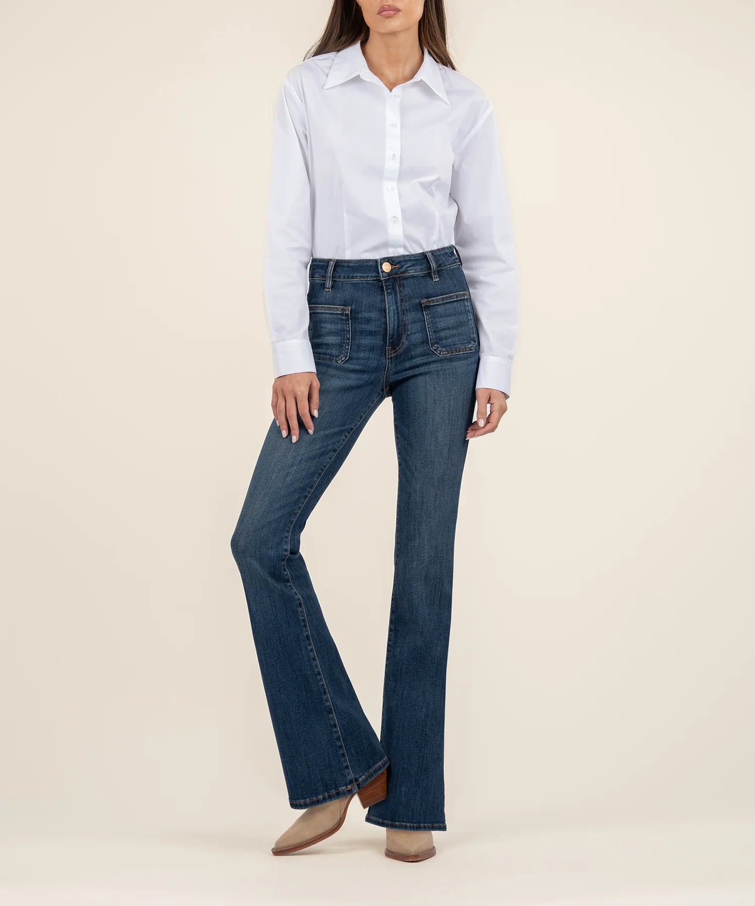 Slim fit through the waist and thighs with a flare at the legs make these flattering for all body types designed in a stretch soft denim with front patch pockets easily elevate your look.