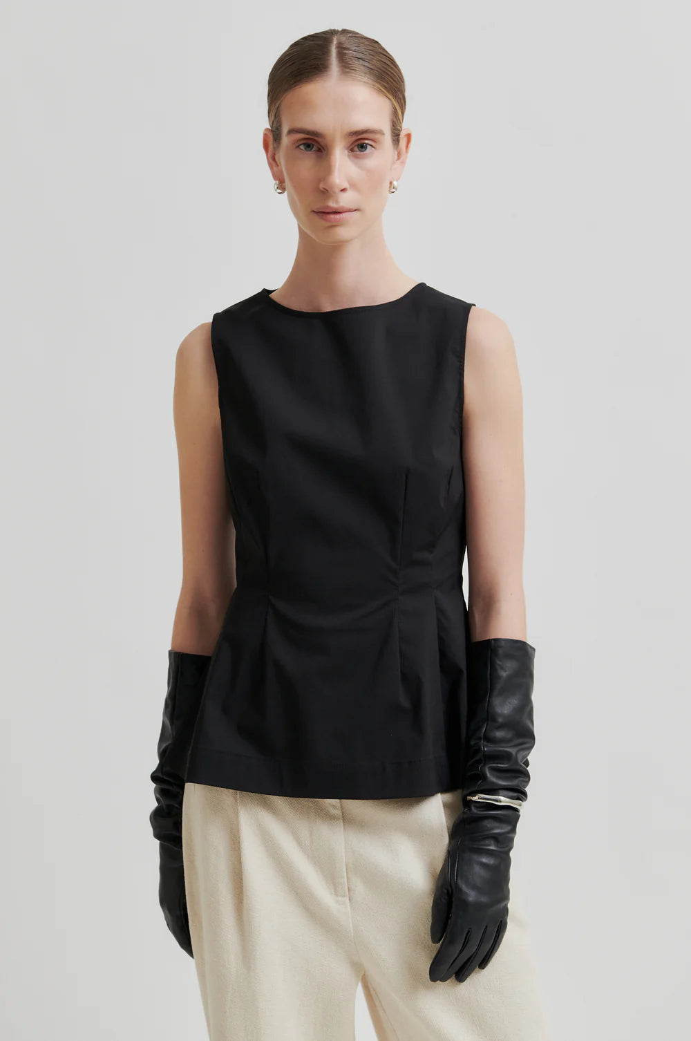Second Female sleeveless top. The top is made in a soft and smooth cotton blend. Featuring a concelaed zip fastening at the back. Fitted seams at the waist that create a slight peplum effect. Slim fit.
