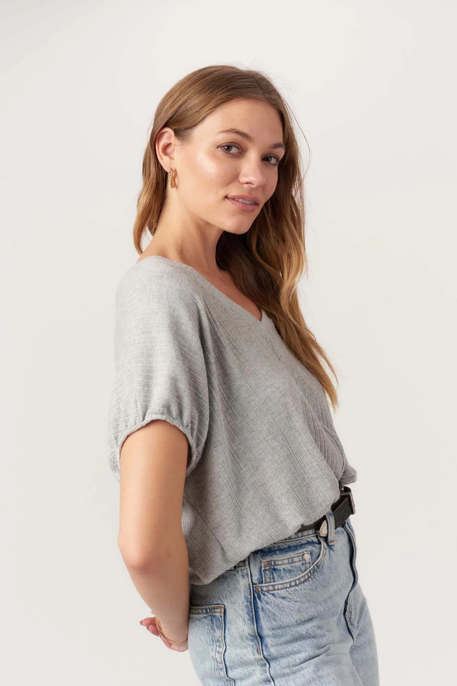 Cerise V-Neck Bubble Rib Tee is made from a soft rib knit with a draped, bubble-style fit. Designed with a relaxed body and a clean V neckline, it’s finished with subtle banded trim that shapes the hemline. An easy, feminine staple that adds a touch of polish to everyday wear.