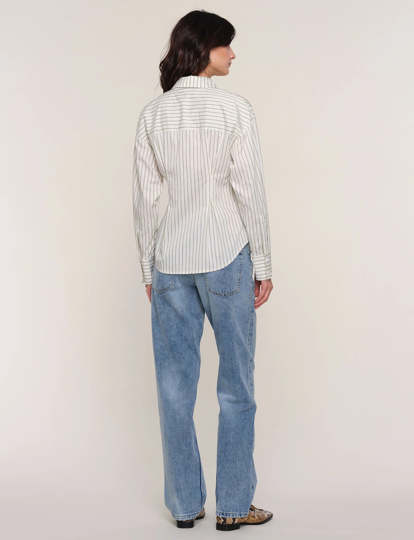 The Darling Shirt is made from a yarn-dye cotton poplin. It has a slim fit, created by inverted pleats at the waist. Wear it with jeans or a mini skirt.