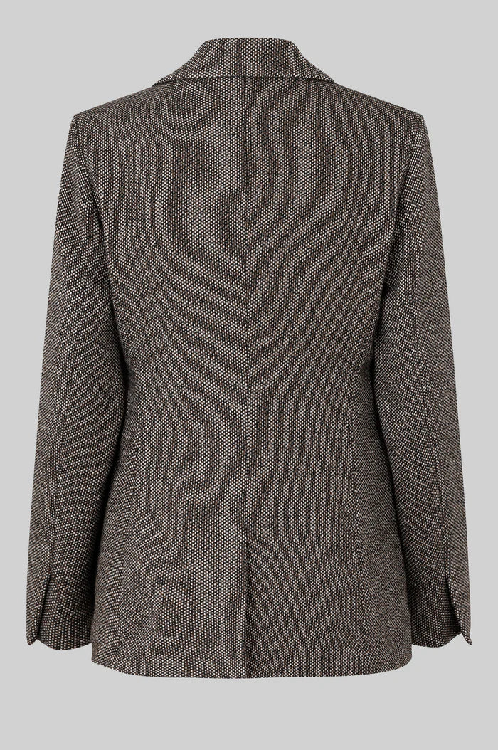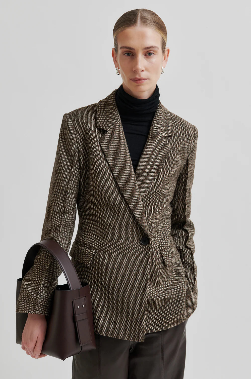 Second Female tailored tweed blazer. The blazer is made in a wool-blend fabric with tweed woven pattern. Featuring a notch lapel and off-centre button fastening. Padded shoulders and long sleeves with stitching details and slits at cuffs. Two flap pockets and slit at back. Fully lined. Slim and contoured fit.