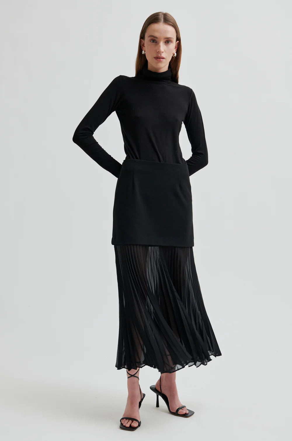Second Female pleated skirt. Made in soft fabric at the top with semi-sheer section from the thighs down. Featuring a concealed zip fastening at the back. Fitted seams at front and back. Slim fit at top with more volume at bottom hem.