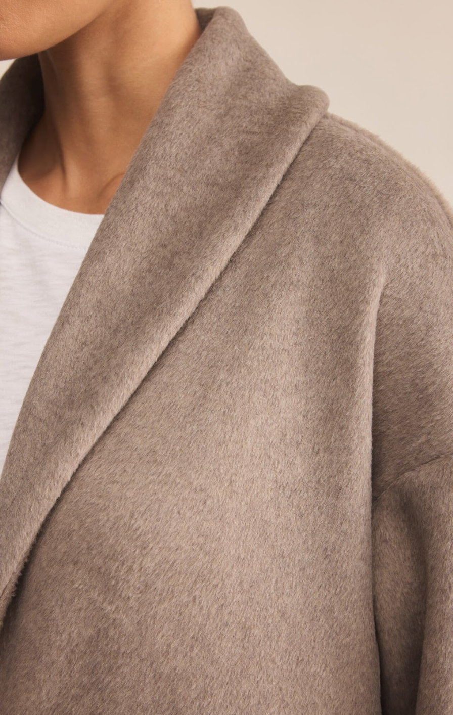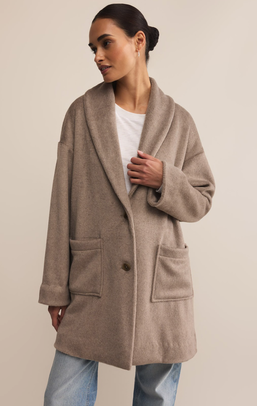 Cozy Peacoat style with a big lapel. Perfect for cozy layering. Relaxed Fit