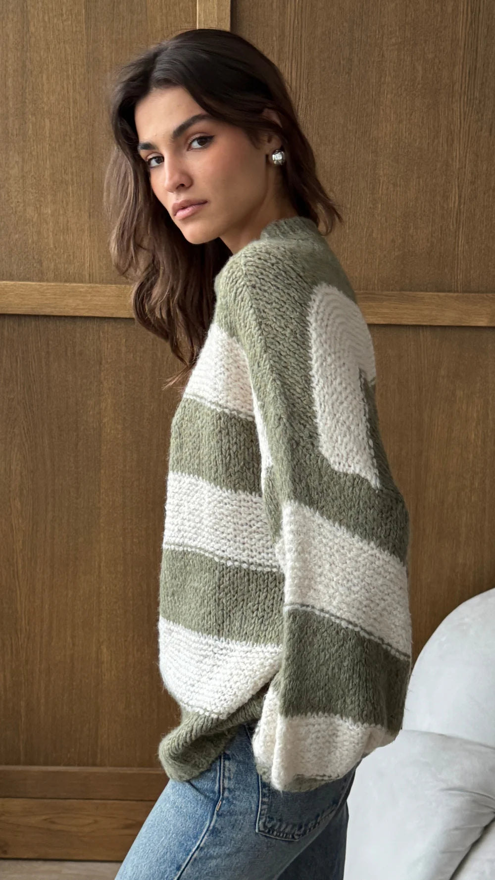 Soft, cosy and light, relaxed fit jumper. Graphic stripes on a neutral base for endless versatility to make an off-duty elevated look. Perfect for layering on cooler days this season - an easy wardrobe staple