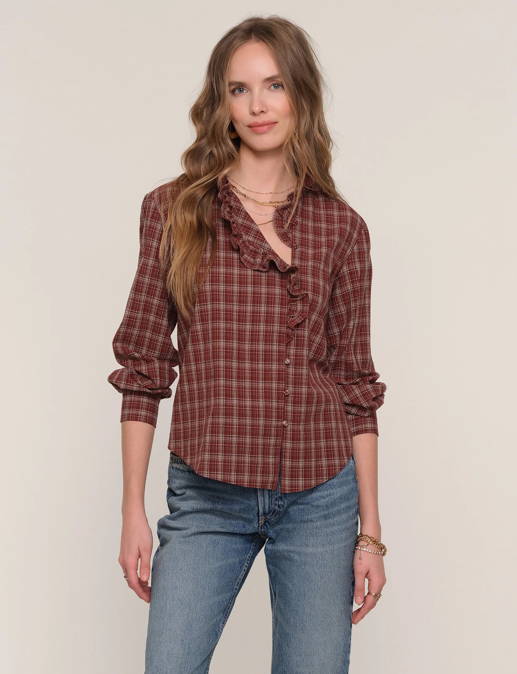 The Taylor Shirt is made from a yarn-dye plaid. A twist on a classic, relaxed fit button down, with a ruffle detail around the neck. It’s light weight and perfect for the transitional season.