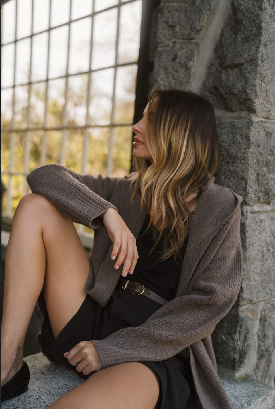 The Ilana cardigan is made of a super soft yarn in a half cardigan stitch. Features include a wide rib at the sleeve and body hem, and a hood for a cozy feel.